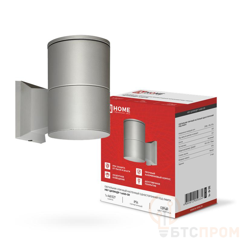 Светильник НБУ ЦИЛИНДР-1хA60-GR IP54 уличный настен. односторон. алюм. сер. IN HOME 4690612059334 фото в каталоге от BTSprom.by
