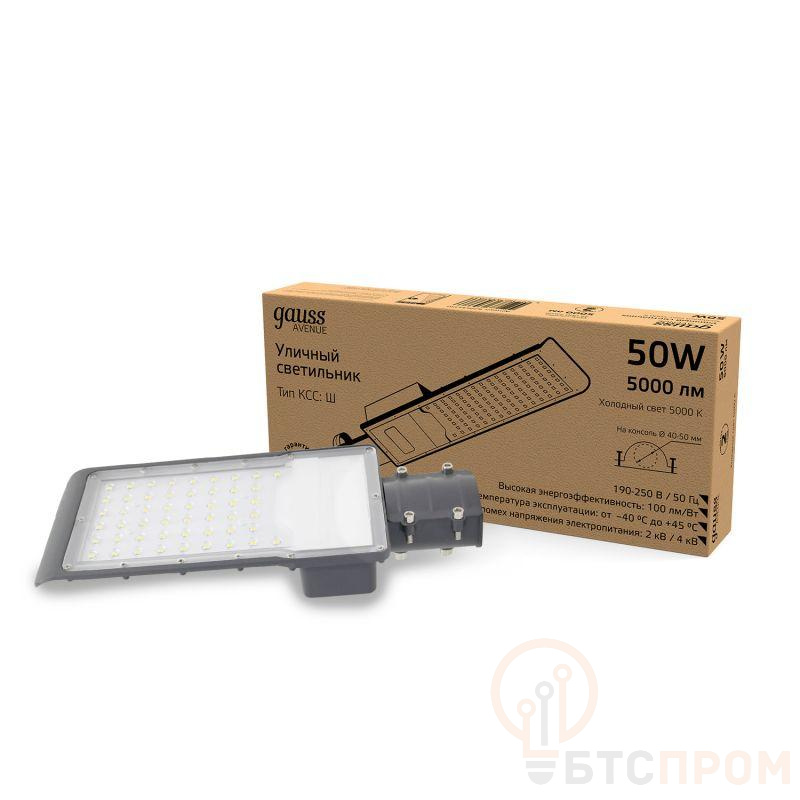 Светильник светодиодный Avenue 50Вт 5000К IP65 5000лм 190-250В 355х155х57мм ДКУ уличный консольный КСС Ш черн. GAUSS 629534350