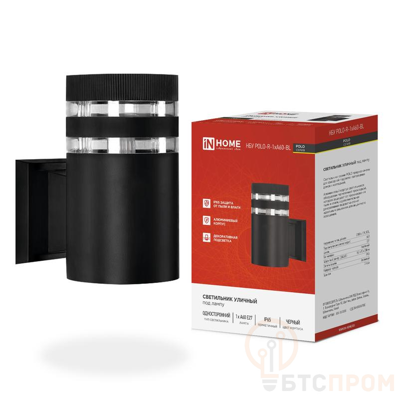 Светильник НБУ POLO-R-1xA60-BL E27 IP65 уличный настен. односторон. под 1хA60 алюм. черн. IN HOME 4690612045061