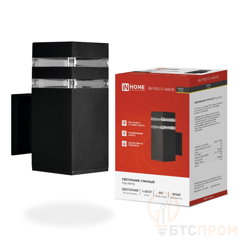 Светильник НБУ POLO-S-1xA60-BL E27 IP65 уличный настен. односторон. под 1хA60 алюм. черн. IN HOME 4690612045078