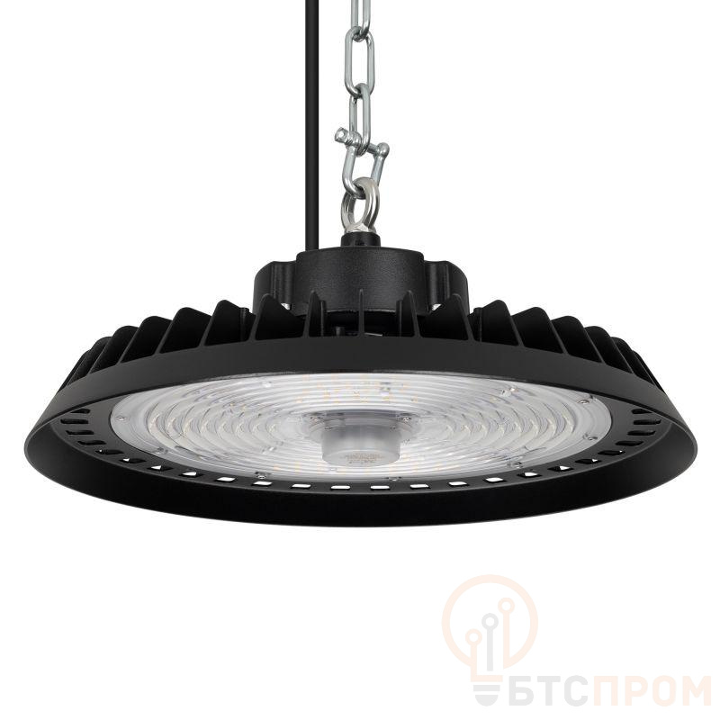 Светильник для освещения складских и промышленных помещений. Мощность 200W, напряжение питания AC 120-270V/50Hz. CRI 80. Тип светодиодов SMD2835, с групповой оптической линзой. Цвет свечения ДНЕВНОЙ 5000K, световой поток 30000 Lm, угол рассеивания 60°. Доступно управление по протоколу 0-10В. Цвет корпуса черный, линза из поликарбоната, степень влагозащиты IP65, ударопрочность IK08. Габариты Ф350xH140мм. Рым-болт в комплекте. Датчик настраивается с помощью пульта 052018 (один на все датчики).