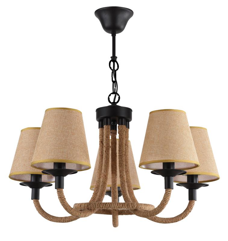 Серия светильников создана под влиянием основных принципов эко-дизайна, с использованием натуральных материалов для предметов интерьера. Арматура люстры из матового черного металла с легким золотым патинированием гармонично сочетается с абажурами из холщовой натуральной ткани. Рожки и центральная часть люстры плотно обвиты холщовой веревкой. Окантовка на верхней и нижней части абажура желто-песочного цвета.