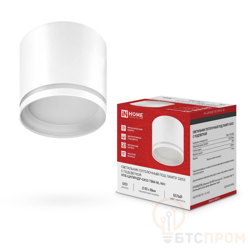 Светильник НПБ-ЦИЛИНДР-GХ53 TBM-NL-WH 80х80мм потолочн. с подсветкой бел. IN HOME 4690612059426 фото в каталоге от BTSprom.by