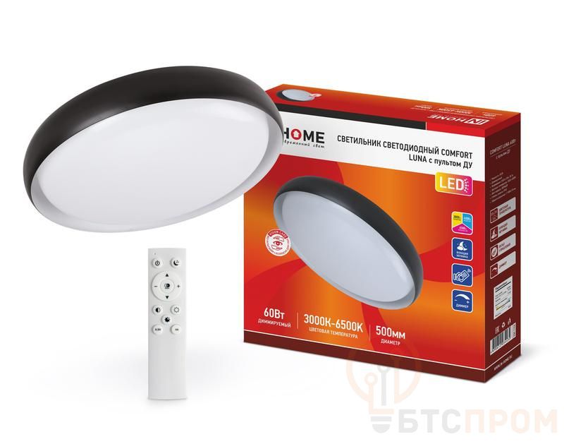 Светодиодный светильник COMFORT LUNA от компании IN Home – это прекрасная альтернатива классической люстры с лампочками. Пульт дистанционного управления позволяет изменять цветовую температуру от уютного теплого (3000К) до холодного белого света (6500K) или приглушить яркость освещения до режима ночника (5% освещенности). Холодный дневной свет создает яркое контрастное освещение, удобное для работы с мелкими предметами и деталями. Теплый свет добавит интерьеру уюта и будет способствовать расслаблению в период вечернего отдыха. Красивый, удобный и суперэкономичный светильник мощностью 60Вт излучает равномерный, комфортный для глаз свет, без пульсаций. Светильник создает оптимальный уровень освещения во внутреннем пространстве площадью до 35 м2. Будет отлично смотреться не только в квартирах и домах (гостиные, спальни, кухни, детские комнаты и др.), но и в гостиницах, отелях, кафе, офисах и магазинах. Умный осветительный прибор оснащен специальным таймером выключения на 30 минут и 1 час. Светильник имеет встроенный драйвер и не нуждается в дополнительном обслуживании. Установка накладным способом на вертикальные или горизонтальные поверхности.