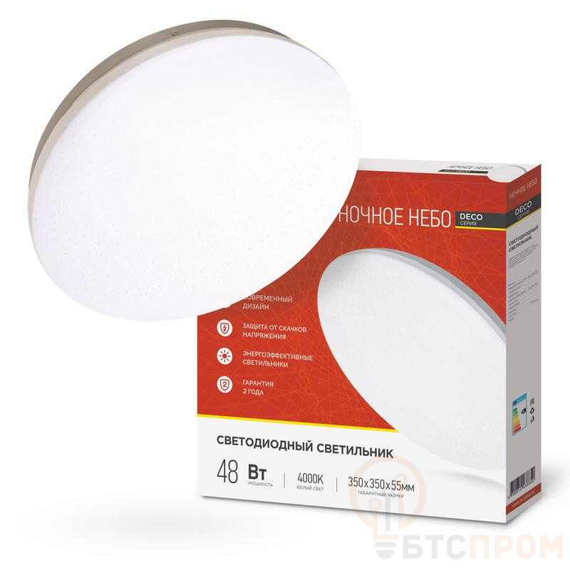 Светодиодный светильник DECO "НОЧНОЕ НЕБО" — это современное и энергоэффективное решение для основного освещения коммерческих и жилых помещений. Модель обладает мощностью 48 Вт и обеспечивает высокий световой поток 4320 люмен, что гарантирует яркое и равномерное освещение без темных зон. Нейтральная цветовая температура 4000К (холодный белый свет) способствует созданию рабочей атмосферы, повышая концентрацию и продуктивность.
