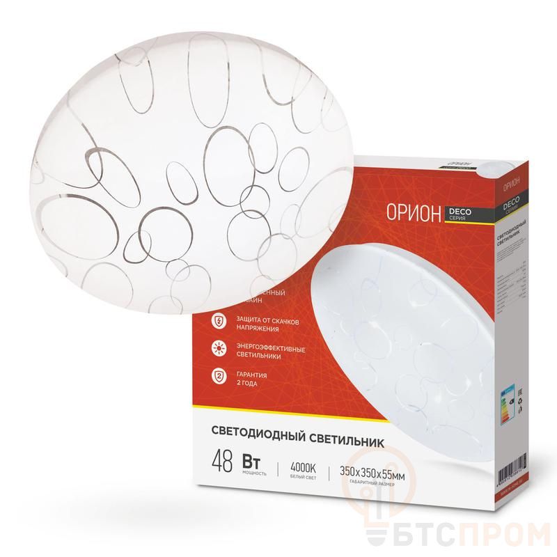 Светильник светодиодный DECO ORION IN HOME — современное энергоэффективное решение для основного и локального освещения. Модель мощностью 48 Вт обеспечивает яркий световой поток 3120 люмен с нейтральной цветовой температурой 4000K (холодный белый), что создает комфортную и рабочую атмосферу без искажения цветов.