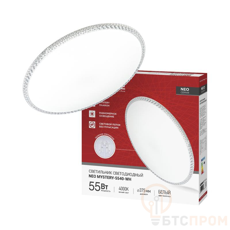 Светодиодный светильник NEO MYSTERY-5540-WH — это современное и эффективное решение для основного освещения жилых и коммерческих помещений. Модель обладает мощностью 55Вт и обеспечивает яркий, комфортный световой поток 4400 лм с нейтральной цветовой температурой 4000K, что идеально подходит для создания продуктивной рабочей атмосферы.