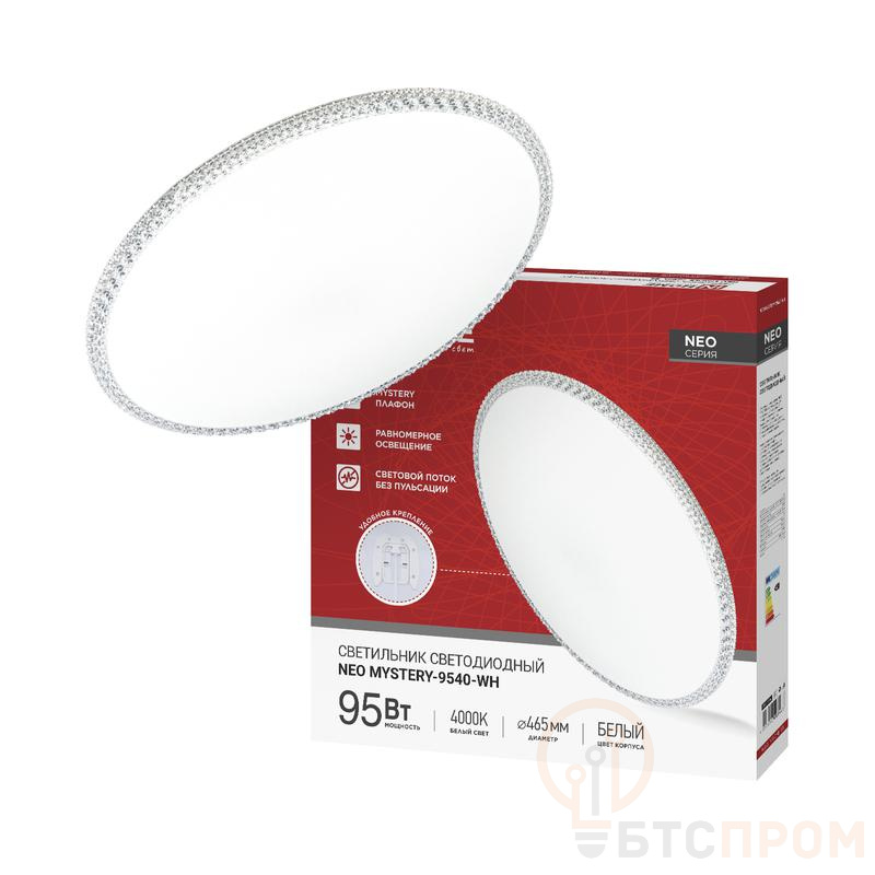 Светодиодный светильник NEO MYSTERY-9540-WH — это современное и высокоэффективное решение для основного освещения коммерческих и промышленных помещений. Модель обладает мощностью 95 Вт и обеспечивает яркий нейтральный свет в 7600 люмен с цветовой температурой 4000K (холодный белый), что создает комфортную и продуктивную атмосферу, не искажая цвета окружающих объектов.
