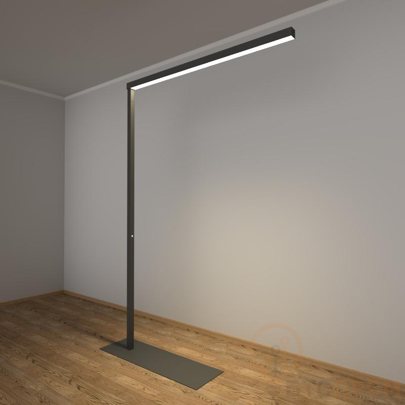 Конструкция светильника состоит из напольной стойки высотой 2100 мм и горизонтальной планарной панели размером 1300x2100 мм. Мощность светодиодной системы составляет 32 Вт, что обеспечивает комфортный нейтральный свет с цветовой температурой 4000K (холодный белый), способствующий концентрации и продуктивной работе. Торшер не требует сложного монтажа — он просто устанавливается на пол и подключается к розетке. Корпус выполнен в классическом черном цвете, что подчеркивает его элегантность и универсальность.