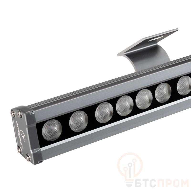 Линейный прожектор. Мощность 36 Вт, св. поток 3600 лм, 80 лм/Вт, дневной 4000 K, CRI>80, угол 15°, напряжение питания 230 В. Серый прямоугольный корпус из алюминия, экран стекло, степень защиты IP65. Размер: длина 1000 мм, ширина 55 мм, высота 78 мм. Монтаж на кронштейнах.