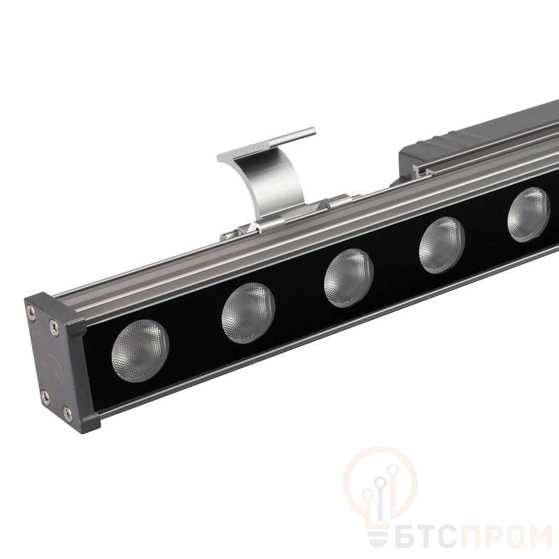 Линейный прожектор. Мощность 12 Вт, св. поток 840 лм, 70 лм/Вт, дневной 4000 K, CRI>80, угол 15x60°, напряжение питания 230 В. Серый прямоугольный корпус из алюминия, экран стекло, степень защиты IP65. Размер: длина 500 мм, ширина 40 мм, высота 30 мм. Монтаж на кронштейнах.