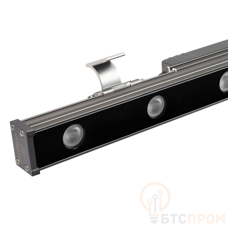 Линейный прожектор. Мощность 6W, световой поток 540 лм, 90 лм/Вт, дневной 4000K, CRI>80, угол 30°, напряжение питания 230V. Серый прямоугольный корпус из алюминия, экран стекло, степень защиты IP65. Размер: длина 500 мм, ширина 40 мм, высота 30мм. Монтаж на кронштейнах.