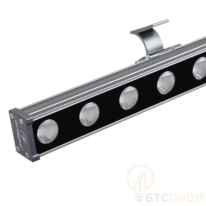 Линейный прожектор. Мощность 18 Вт, св. поток 1440 лм, 80 лм/Вт, тёплый 3000 K, CRI>80, угол 15x60°, напряжение питания 230 В. Серый прямоугольный корпус из алюминия, экран стекло, степень защиты IP65. Размер: длина 760 мм, ширина 40 мм, высота 30 мм. Монтаж на кронштейнах.