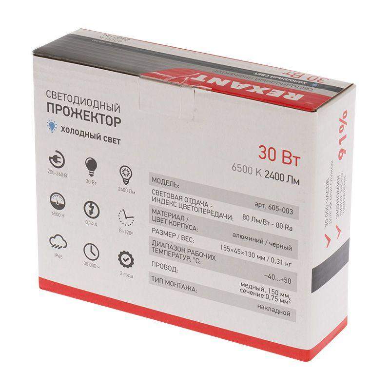 Влагозащищенный светодиодный прожектор REXANT мощностью 30 Вт предназначен для наружного и внутреннего освещения. Благодаря высокому уровню герметичности (степень защиты IP65) прожектор может использоваться для наружного освещения фасадов зданий, рекламных объектов, детских и спортивных площадок, памятников и инсталляций, промышленных и складских помещений, внутренних дворов, придомовых территорий. Оборудован поворотной скобой, позволяющей легко регулировать угол освещения. Световой поток составляет 2400 Лм. Цветовая температура свечения прожектора - 6500К. Прочный алюминиевый корпус не подвержен деформации и устойчив к механическим повреждениям.