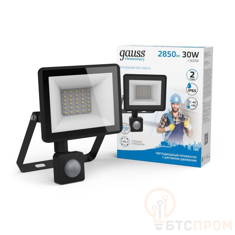 Прожектор светодиодный Elementary-S 30Вт 6500К IP65 2850лм 175-265В ДО с датчиком движения черн. GAUSS 628511330