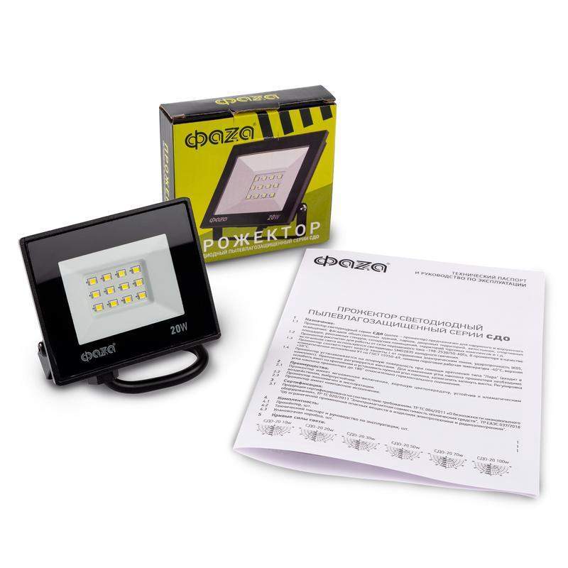 –Прожектор светодиодный СДО-20 20Вт 6500К IP65 230В BL ДО прозр. закален. стекло ФАZА 5047266