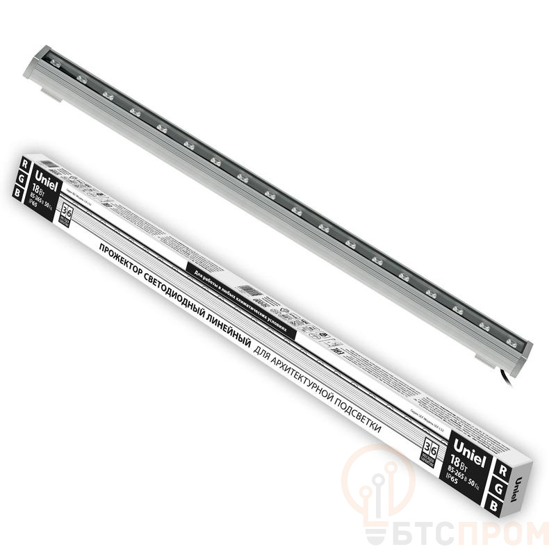 Прожектор светодиодный линейный ULF-L52-18W/RGB/L100 от Uniel — современное решение для архитектурной и декоративной подсветки. Модель длиной 1000 мм выполнена в серебристом алюминиевом корпусе с высокой степенью защиты IP65, что обеспечивает надежную работу в уличных условиях при любых погодных явлениях.