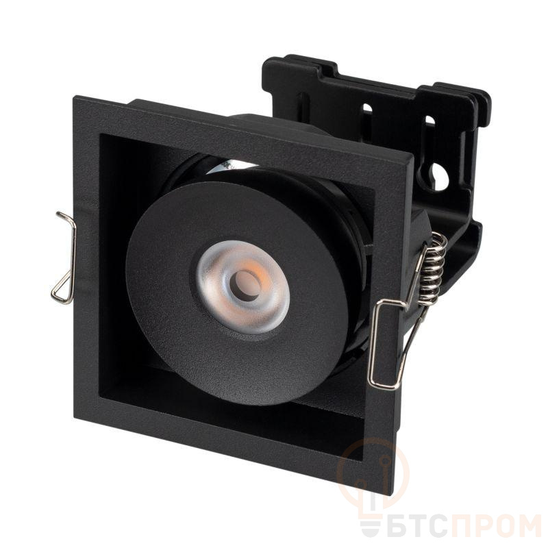 Встраиваемый поворотный светильник для потолка. Мощность 9W, цвет ТЕПЛЫЙ 3000K, св.поток 630лм, угол 45°, RA>90. Корпус квадратный черный. Питание AC230V. Размеры LxWxH 80x80x90мм. Установка в отверстие 70x70мм. Драйвер в комплекте (30-45V, 220mA).