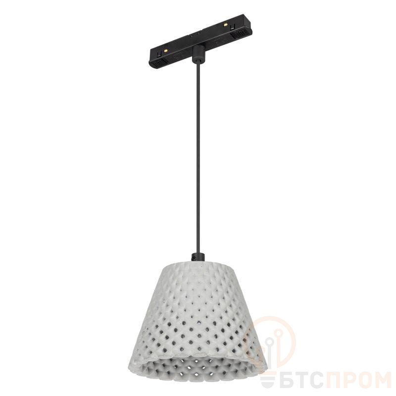 Светильник для магнитных треков MAG-ORIENT шириной 26 мм. Мощность 5 Вт, св. поток 120 лм, Теплый 3000 K, CRI>90, угол 80°, напряжение питания 48 В. Серый фигурный корпус из композитного материала на основе гипса, степень защиты IP20. Размер светоизлучающего модуля: 135*100 мм. Длина подвеса 1500мм. Монтаж на трек MAG-ORIENT. Подвес не регулируется.