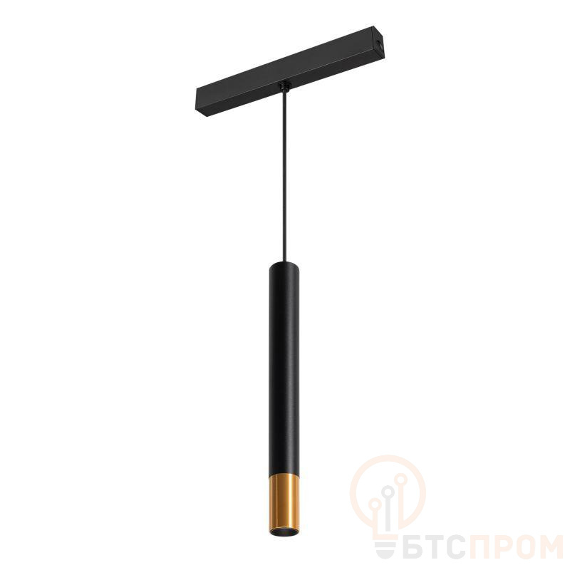 Светильник подвесной для магнитных треков шириной 25мм, 5Вт. Цвет свечения ТЕПЛЫЙ 3000K, световой поток 300лм, угол 45°, CRI>90. Корпус цилиндрический, металл, цвет черный с золотой вставкой, IP20. Размер светового модуля 30*300 мм; размер установочного модуля 200*20*25мм; длина подвеса 1400 мм. Входное напряжение DC24V, мощность 5Вт. Драйвер DС24V/AC230V поставляется отдельно. Диммируется только с 026407, 027633. Подвес регулируется.
