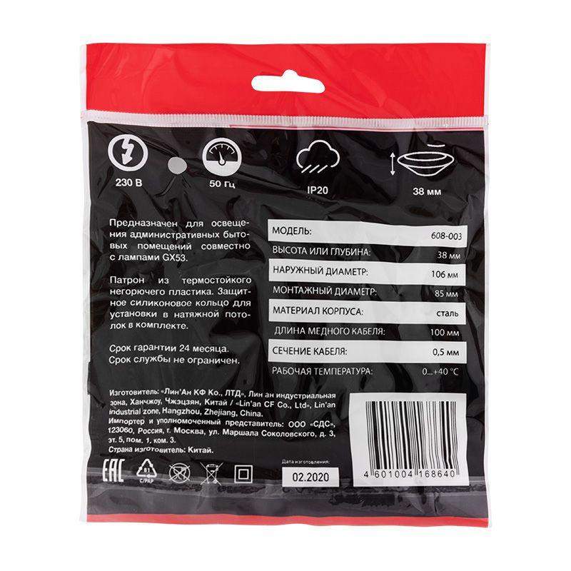 Встраиваемый светильник GX53 предназначен для подключения лампы с цоколем GX53. Подходит для монтажа к потолку любого типа. Толстостенный корпус из стали покрыт антикоррозийным составом, устойчив к механическим воздействиям. Отличается очень малой глубиной монтажа. Патрон выполнен из термостойкого негорючего пластика, поэтому не деформируется под воздействием высоких температур и отвечает всем требованиям пожарной безопасности. Благодаря компактному размеру и небольшому весу светильник легко устанавливается без специальных инструментов. Также в комплект входит силиконовое кольцо для монтажа на натяжных потолках.