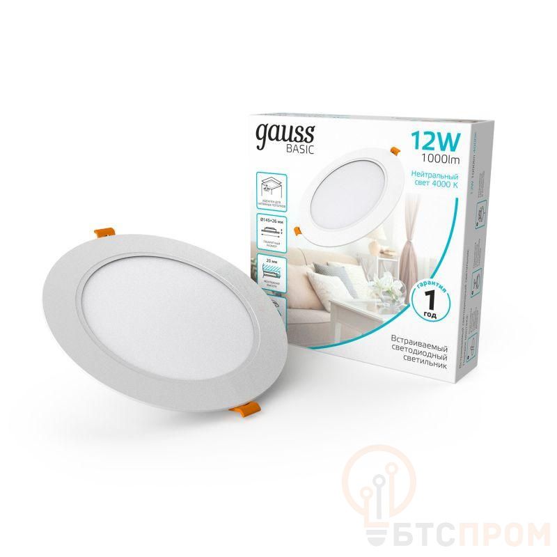 Светильник светодиодный Basic Downlight 12Вт 4000К IP20 1000m 170-260В 145х26 круг бел. GAUSS 9030420212