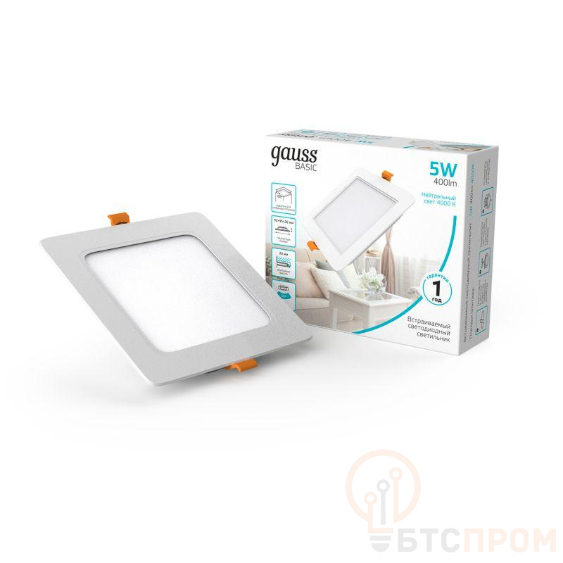 Светильник светодиодный Basic Downlight 5Вт 4000К IP20 400лм 170-260В 95х26 квадрат бел. GAUSS 9031420205
