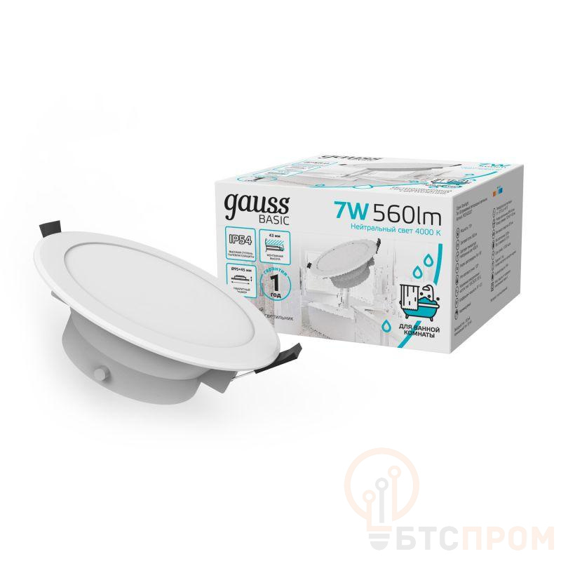 Светильник светодиодный Basic Downlight 7Вт 4000К IP54 560лм 185-250В 95х45 круг бел. GAUSS 9033420207