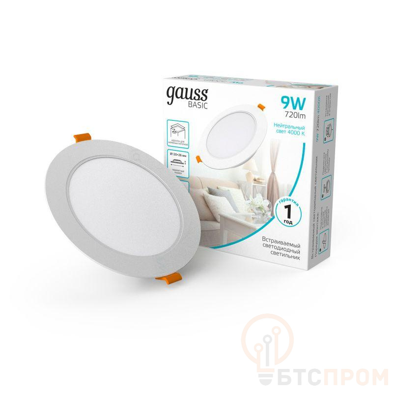Светильник светодиодный Basic Downlight 9Вт 4000К IP20 720лм 170-260В 120х26 круг бел. GAUSS 9030420209