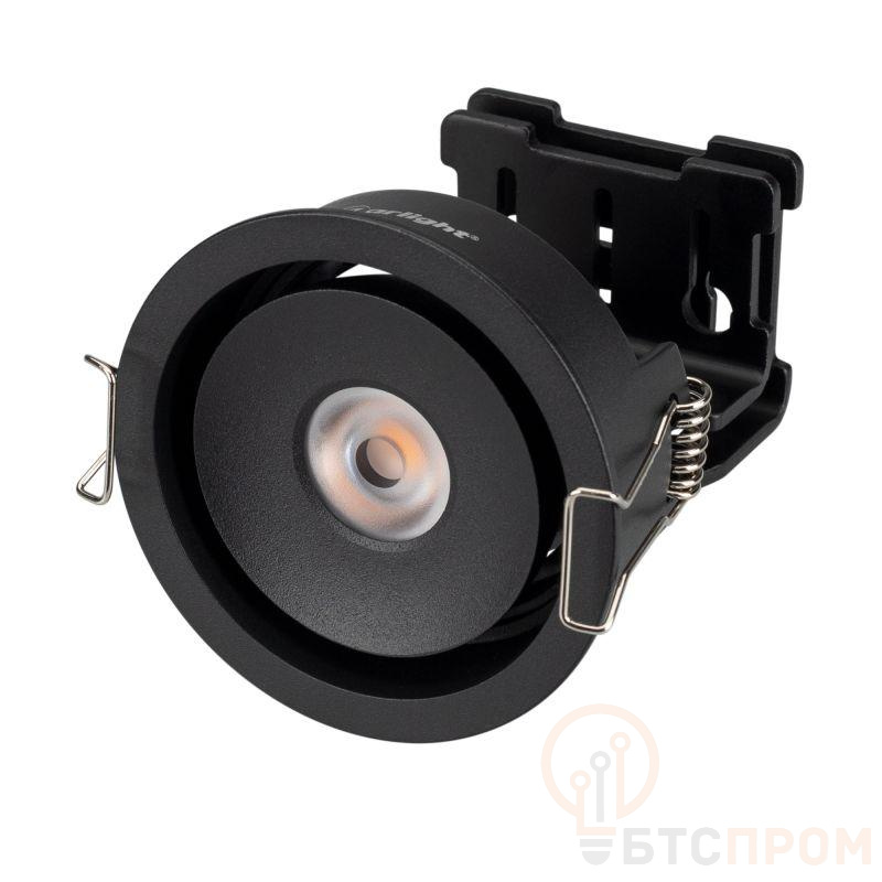 Встраиваемый поворотный светильник для потолка. Мощность 9W, цвет ТЕПЛЫЙ 3000K, св.поток 630лм, угол 45°, RA>90. Корпус черный. Питание AC230V. Размеры DxH O78x90мм. Установка в отверстие O70мм. Драйвер в комплекте (30-45V, 220mA).