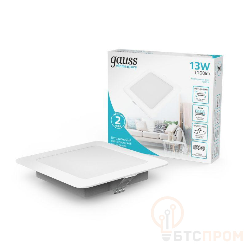 Светодиодный светильник Gauss Elementary Downlight — это современное и энергоэффективное решение для организации основного или локального освещения в жилых и коммерческих помещениях. Модель с потребляемой мощностью 13 Вт обеспечивает мощный световой поток 1100 лм, создавая комфортную и равномерную засветку.