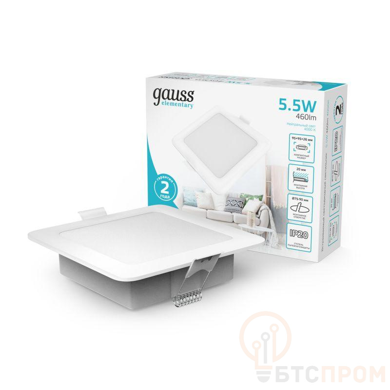 Светильник светодиодный Elementary Downlight 5.5Вт 4000К 460лм 170-260В IP20 95х26 квадрат монтаж бел. GAUSS 998420205