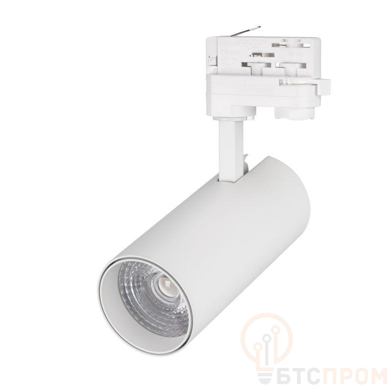 Светильник для треков/шин 4 провода для продуктов. Мощность 20 Вт, св. поток 1700 лм, 85 лм/Вт, специальный холодный 7500 K для рыбы и морепродуктов, угол 24°, напряжение питания 230 В. Белый корпус из алюминия, материал линзы PMMA, степень защиты IP20. Размер: диаметр 74 мм, высота 160 мм. Монтаж на трек 3-фазный. Драйвер 30-42 В, 500 мА, пульсация <1%.