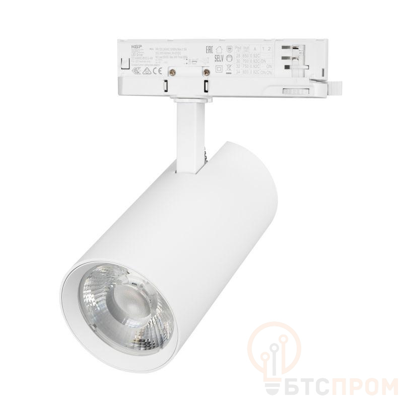 Светильник для треков/шин 4 провода. Мощность 30 Вт, св. поток без решетки honeycomb 3000 лм, 100 лм/Вт, с решеткой honeycomb 1980 лм, 66 лм/Вт, дневной 4000 K, CRI>90, угол 24°, напряжение питания 230 В. Белый круглый корпус из алюминия, материал линзы PMMA, степень защиты IP20. Размер: диаметр 90 мм, длина световой части 141 мм. Монтаж на трек 3-фазный. Драйвер встроенный 24-42 В, 750мА., пульсация <5%