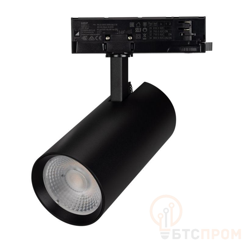 Светильник для треков/шин 4 провода. Мощность 30 Вт, св. поток без решетки honeycomb 3000 лм, 100 лм/Вт, с решеткой honeycomb 1980 лм, 66 лм/Вт, теплый 3000 K, CRI>90, угол 55°, напряжение питания 230 В. Черный круглый корпус из алюминия, материал линзы PMMA, степень защиты IP20. Размер: диаметр 90 мм, длина световой части 141 мм. Монтаж на трек 3-фазный. Драйвер встроенный 24-42 В, 750мА., пульсация <5%