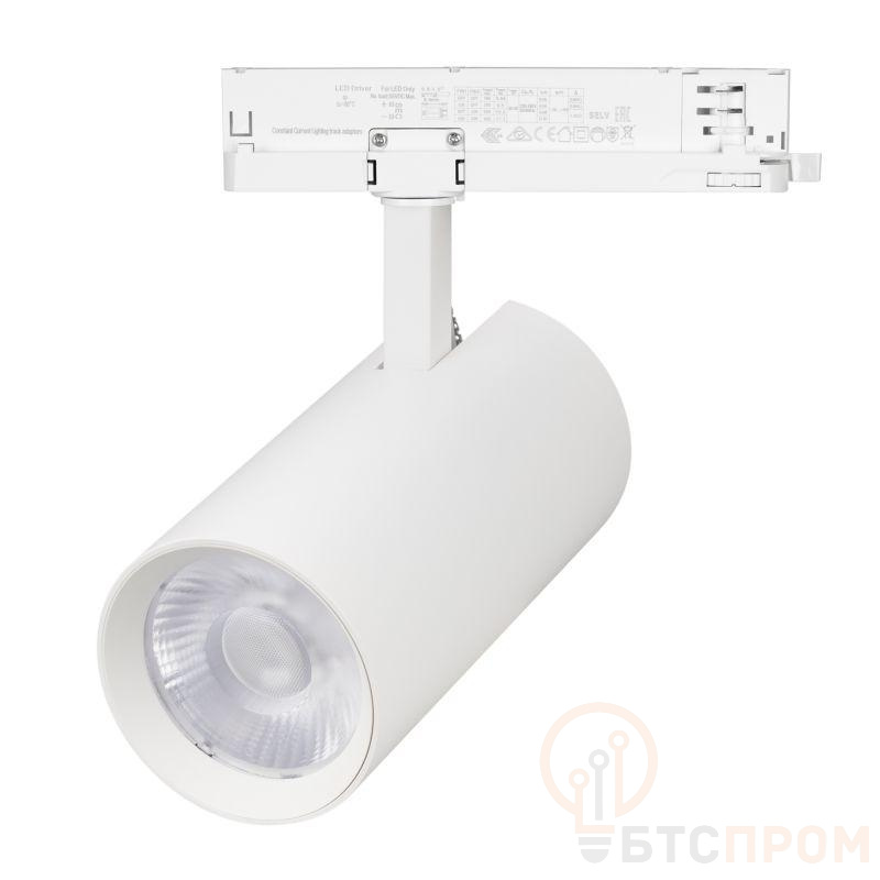 Светильник для треков/шин 4 провода. Мощность 40Вт, св. поток без решетки honeycomb 4000 лм, 100 лм/Вт, с решеткой honeycomb 2640 лм, 66 лм/Вт, дневной 4000 K, CRI>90, угол 15°, напряжение питания 230 В. Белый круглый корпус из алюминия, материал линзы PMMA, степень защиты IP20. Размер: диаметр 90 мм, длина световой части 141 мм. Монтаж на трек 3-фазный. Драйвер встроенный 24-42 В, 750мА., пульсация <5%