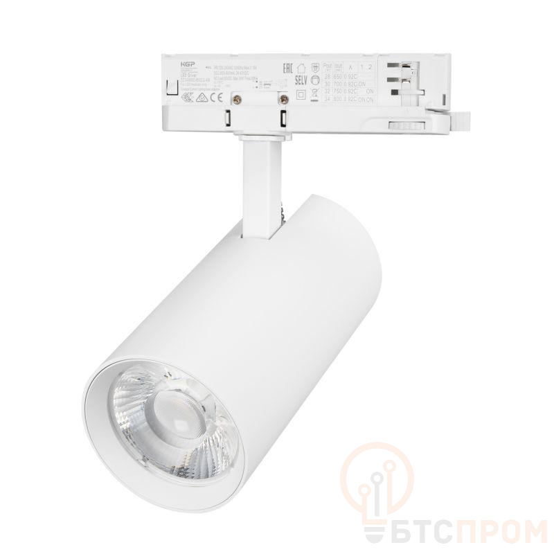 Светильник для треков/шин 4 провода. Мощность 40Вт, св. поток без решетки honeycomb 4000 лм, 100 лм/Вт, с решеткой honeycomb 2640 лм, 66 лм/Вт, дневной 4000 K, CRI>90, угол 36°, напряжение питания 230 В. Белый круглый корпус из алюминия, материал линзы PMMA, степень защиты IP20. Размер: диаметр 90 мм, длина световой части 141 мм. Монтаж на трек 3-фазный. Драйвер встроенный 24-42 В, 750мА., пульсация <5%