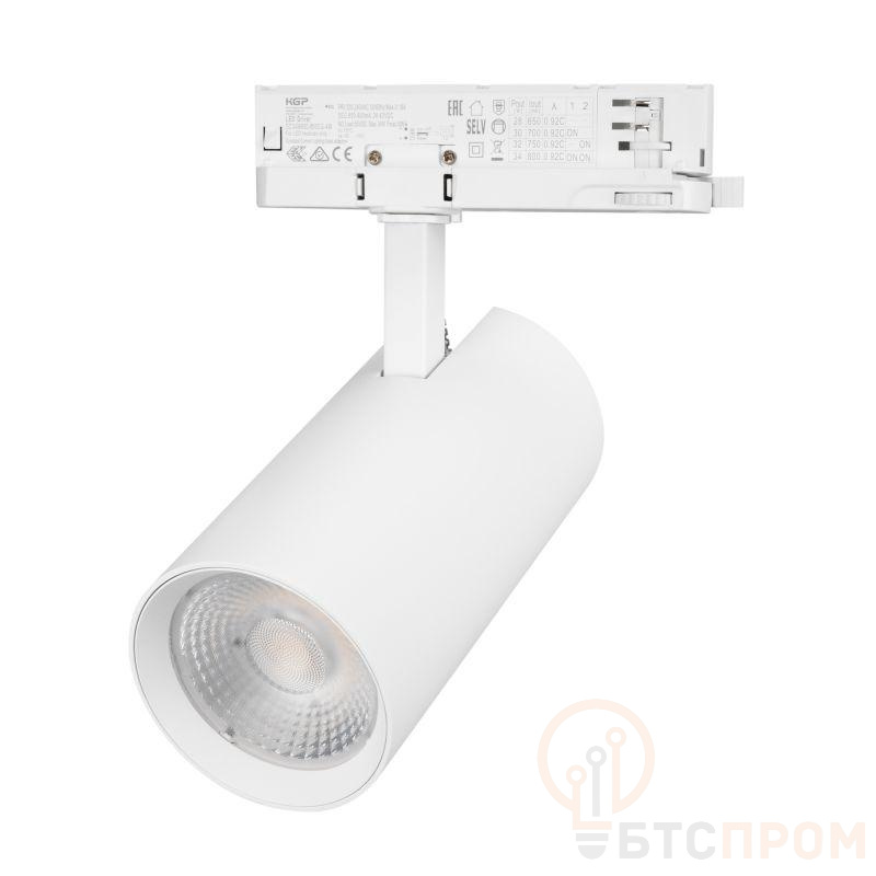 Светильник для треков/шин 4 провода. Мощность 40Вт, св. поток без решетки honeycomb 4000 лм, 100 лм/Вт, с решеткой honeycomb 2640 лм, 66 лм/Вт, дневной 4000 K, CRI>90, угол 55°, напряжение питания 230 В. Белый круглый корпус из алюминия, материал линзы PMMA, степень защиты IP20. Размер: диаметр 90 мм, длина световой части 141 мм. Монтаж на трек 3-фазный. Драйвер встроенный 24-42 В, 750мА., пульсация <5%