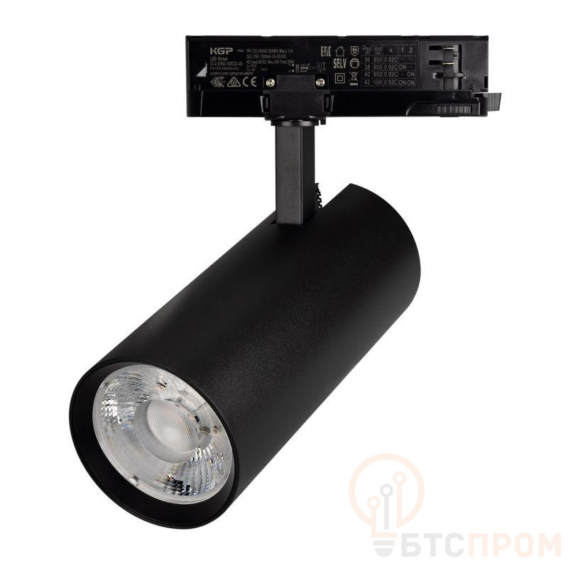 Светильник для треков/шин 4 провода. Мощность 40Вт, св. поток без решетки honeycomb 4000 лм, 100 лм/Вт, с решеткой honeycomb 2640 лм, 66 лм/Вт, теплый 3000 K, CRI>90, угол 24°, напряжение питания 230 В. Черный круглый корпус из алюминия, материал линзы PMMA, степень защиты IP20. Размер: диаметр 90 мм, длина световой части 141 мм. Монтаж на трек 3-фазный. Драйвер встроенный 24-42 В, 750мА., пульсация <5%