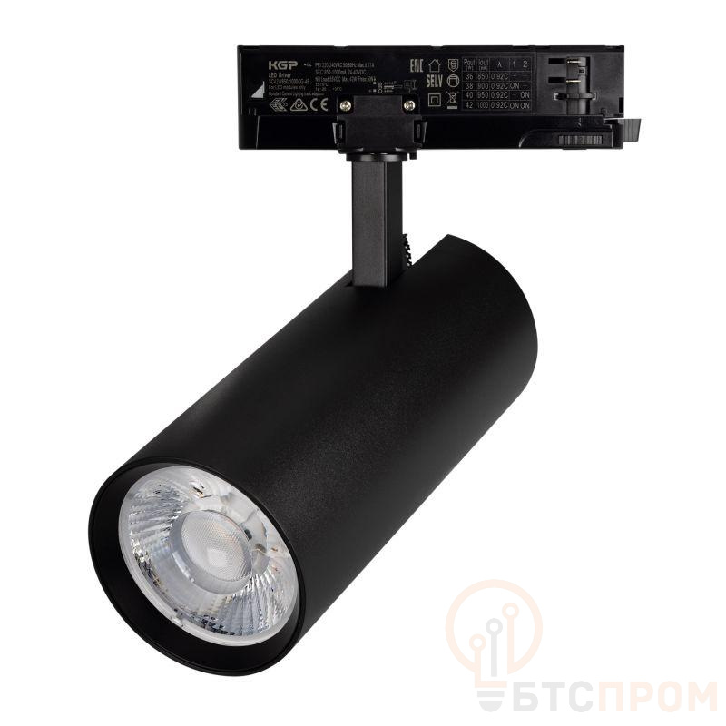 Светильник для треков/шин 4 провода. Мощность 40Вт, св. поток без решетки honeycomb 4000 лм, 100 лм/Вт, с решеткой honeycomb 2640 лм, 66 лм/Вт, теплый 3000 K, CRI>90, угол 36°, напряжение питания 230 В. Черный круглый корпус из алюминия, материал линзы PMMA, степень защиты IP20. Размер: диаметр 90 мм, длина световой части 141 мм. Монтаж на трек 3-фазный. Драйвер встроенный 24-42 В, 750мА., пульсация <5%
