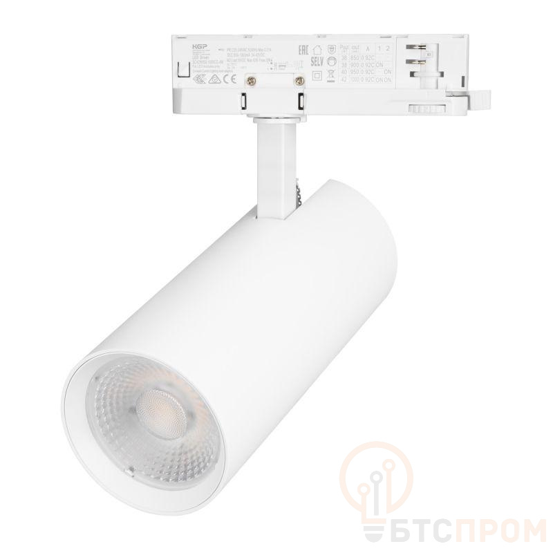 Светильник для треков/шин 4 провода. Мощность 40Вт, св. поток без решетки honeycomb 4000 лм, 100 лм/Вт, с решеткой honeycomb 2640 лм, 66 лм/Вт, теплый 3000 K, CRI>90, угол 55°, напряжение питания 230 В. Белый круглый корпус из алюминия, материал линзы PMMA, степень защиты IP20. Размер: диаметр 90 мм, длина световой части 141 мм. Монтаж на трек 3-фазный. Драйвер встроенный 24-42 В, 750мА., пульсация <5%
