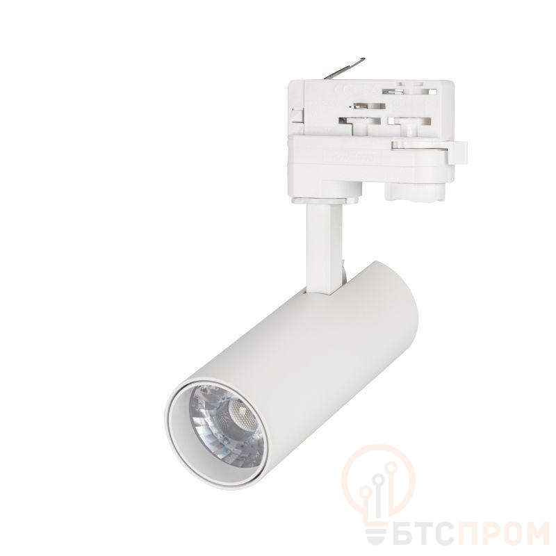 Светильник для треков/шин 4 провода. Мощность 10 Вт, св. поток 761 лм, 76 лм/Вт, теплый 3000 K, CRI98, угол 24°, напряжение питания 230 В. Белый корпус из алюминия, материал линзы PMMA, степень защиты IP20. Размер: длина 145 мм, ширина 55 мм, высота 145 мм. Монтаж на трек 3-фазный. Драйвер 27-38 В, 260 мА, пульсация <1%.