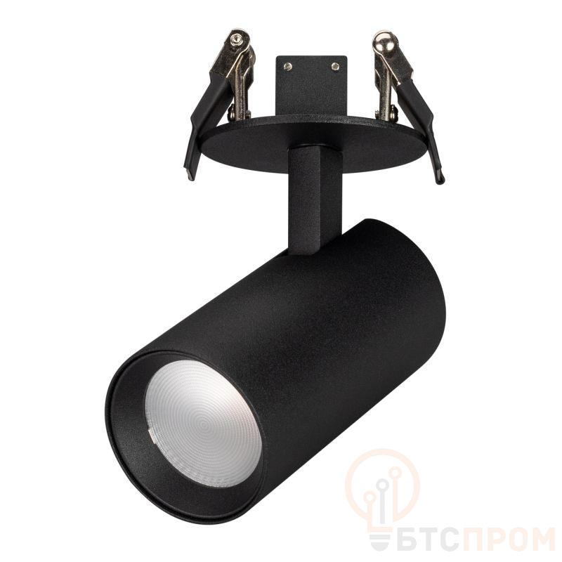 Встраиваемый поворотный светильник для потолка. Мощность 9 Вт, св. поток 666 лм, 74 лм/Вт, дневной 4000 K, CRI>90, угол 25°, напряжение питания 230 В. Черный корпус из алюминия, линза PC, степень защиты IP20. Размер: диаметр 55 мм, длина 110 мм, высота 80 мм. Угол поворота 350°, угол наклона 90°. Монтаж встраиваемый, установочное отверстие диаметр 60 мм, глубина 30 мм. Драйвер 30-45 В, 220 мА, пульсация <5%.