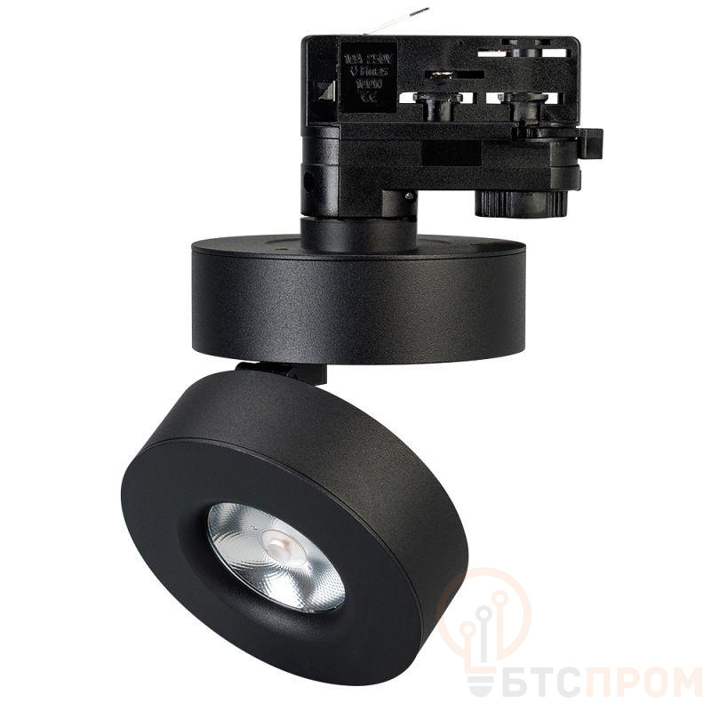 Светильник откидной для треков/шин 4 провода, 12Вт. Цвет свечения ТЕПЛЫЙ 3000K, световой поток 770лм, CRI>90, угол свечения 24°, угол поворота 355°, угол наклона 90°. Корпус круглый, металл, цвет черный, IP40. Размер DxH O100x105мм. Питание AC 220-240V, 12Вт, драйвер встроенный (DC 300mA, 28-42V).