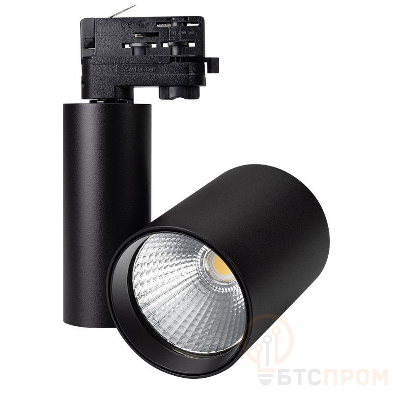 Светильник для треков/шин 4 провода для продуктов. Мощность 40 Вт, св. поток 4000 лм, 100 лм/Вт, специальный теплый 2500 K для выпечки, угол 24°, напряжение питания 230 В. Черный корпус из алюминия, материал линзы PMMA, степень защиты IP20. Размер: диаметр 100 мм, высота 130 мм. Монтаж на трек 3-фазный. Драйвер 30-42 В, 1000 мА, пульсация <1%.