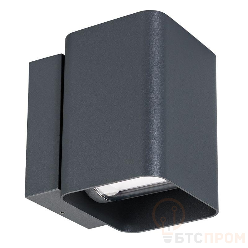 Накладной настенный светильник, свечение вверх/вниз. Мощность 12 Вт, св. поток 820 лм, 68 лм/Вт, теплый 2700 K, CRI>80, изменяемый угол освещения 0°-80°, напряжение питания 230 В. Темно-серый фигурный корпус из алюминия, экран ударопрочный PC, степень защиты IP54. Размер: длина 138 мм, ширина 104 мм, высота 129 мм. Монтаж накладной. Драйвер встроенный, пульсация <2%.