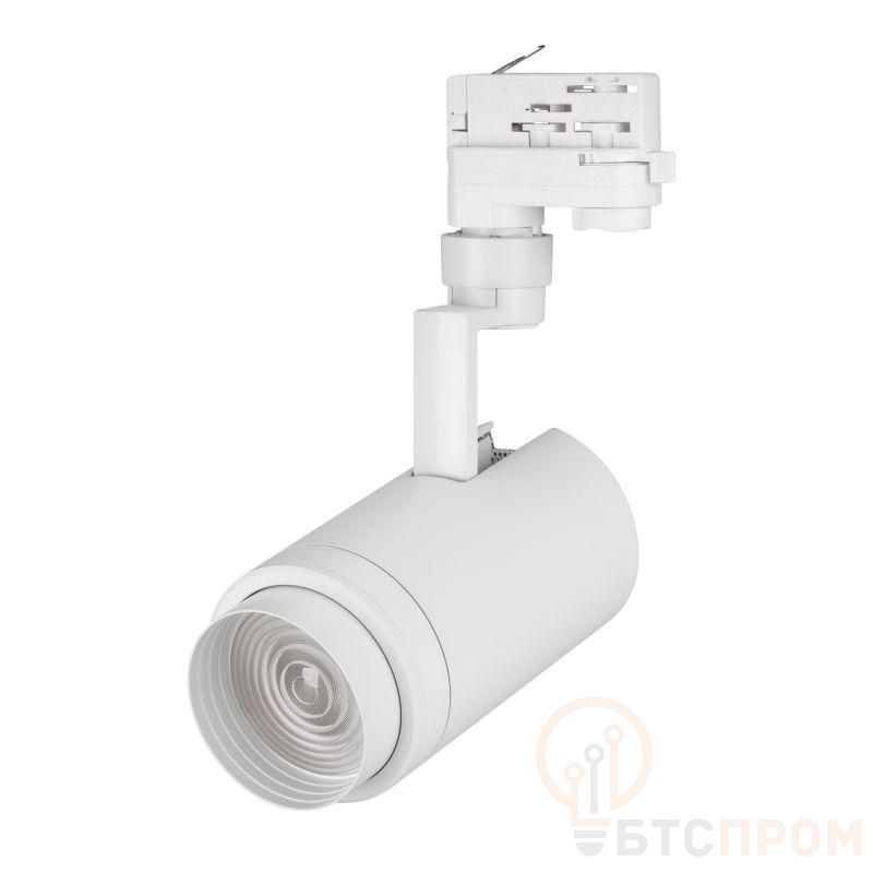 Светильник для треков/шин 4 провода для продуктов. Мощность 20 Вт, св. поток 1930 лм, 97 лм/Вт, специальный дневной 5000 K для зеленых овощей и фруктов, изменяемый угол 20-60°, напряжение питания 230 В. Белый корпус из алюминия, материал линзы PMMA, степень защиты IP20. Размер: диаметр 88 мм, высота 220 мм. Монтаж на трек 3-фазный. Драйвер 27-42 В, 500 мА, пульсация <1%.