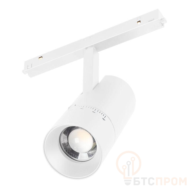 Светильник для магнитных треков MAG-ORIENT шириной 26 мм, с управлением по DALI. Мощность 15 Вт, св. поток 1100 лм, 73 лм/Вт, теплый 3000 K, CRI>90, угол 34-60°, напряжение питания 48 В. Белый фигурный корпус из металл, экран поликарбонат, степень защиты IP20. Размеры LxWxH 204x66x211 мм. Длина светоизлучающего модуля 145мм. Монтаж на трек MAG-ORIENT. Изменяемый угол светового потока, шаг регулировки 1 градус.