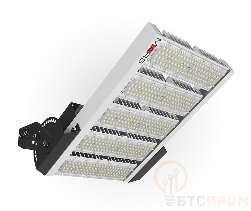 О ПРОДУКТЕ Светодиодный прожектор модульного типа. Предназначен для освещения больших открытых территорий (парковок у ТЦ, спортивных полей и стадионов, мест стоянки воздушных судов, морпортов, перронов и привокзальных площадей карьеров, транспортных развязок) с установкой на осветительные прожекторные мачты. За счет широкого температурного диапазона возможно пррименение в горячих цехах. Применяется на высоте подвеса от 8 до 40 метров. КОНСТРУКЦИЯ Корпус выполнен из алюминиевого сплава, окрашенного порошковой краской. Благодаря геометрии и эффективному теплоотводу, имеет компактные габаритные размеры и небольшой вес. Алюминиевые светодиодные модули соединяются жесткой стальной рамой ОПТИЧЕСКАЯ ЧАСТЬ Вторичная оптика выполнена из светостабилизированного полимера с максимальным коэффициентом светопропускания. Каждый модуль имеет возможность менять угол поворота, тем самым, позволяет максимально точно настраивать направление КСС по месту установки. В одной световой установке могут быть применены различные типы вторичной оптики для создания максимально равномерного освещения и сокращения мест установки светильников УСТАНОВКА Прожектор крепится на опорную поверхность с возможностью регулировки угла наклона. Поверхность может быть как горизонтальной, так и вертикальной. Кронштейн для крепления прожектора входит в комплект поставки ХАРАКТЕРИСТИКИ Цветовая температура: 4000 K или 5000 K (3000 К – опционально) Индекс цветопередачи (Ra): 70…79 (80...89, 90...99 – опционально) Степень защиты от пыли и влаги по стандарту IP65 Защита от 380 В ДОПОЛНИТЕЛЬНО Кабельный переходник IP66 (для быстрой и легкой коммутации светильника там, где нужна повышенная защита от пыли и влаги) Расширенный диапазон входного напряжения 180-528VAC. Защита от 440 В. Компенсация старения светодиодов – постоянный световой поток на протяжении всего времени эксплуатации светильника. Защита от импульсных перенапряжений до 10 кВ (грозозащита). Регулировка светового потока светильника в зависимости от времени суток (реле времени). Расширенная гарантия до 7 лет Светодиоды: OSRAM