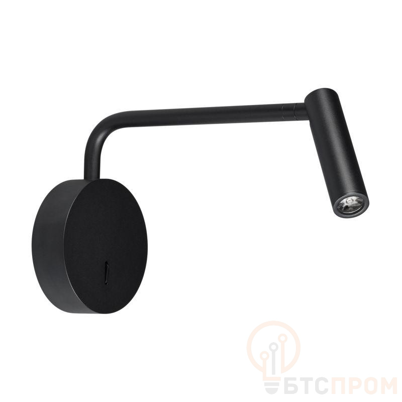 Накладной настенный светильник. Мощность 3 Вт, св. поток 180 лм, 60 лм/Вт, теплый 3000К, CRI>90, угол 20°, напряжение питания 230 В. Черный корпус из алюминия (основание, ножка, светоизлучаль в форме спота), степень защиты IP20. Размер основания O100?31 мм, размер ножки O12,6?210?50мм, размер светоизлучателя O25?100 мм. Драйвер встроенный (700 мА, 2,5-4,5 В), пульсация <1%